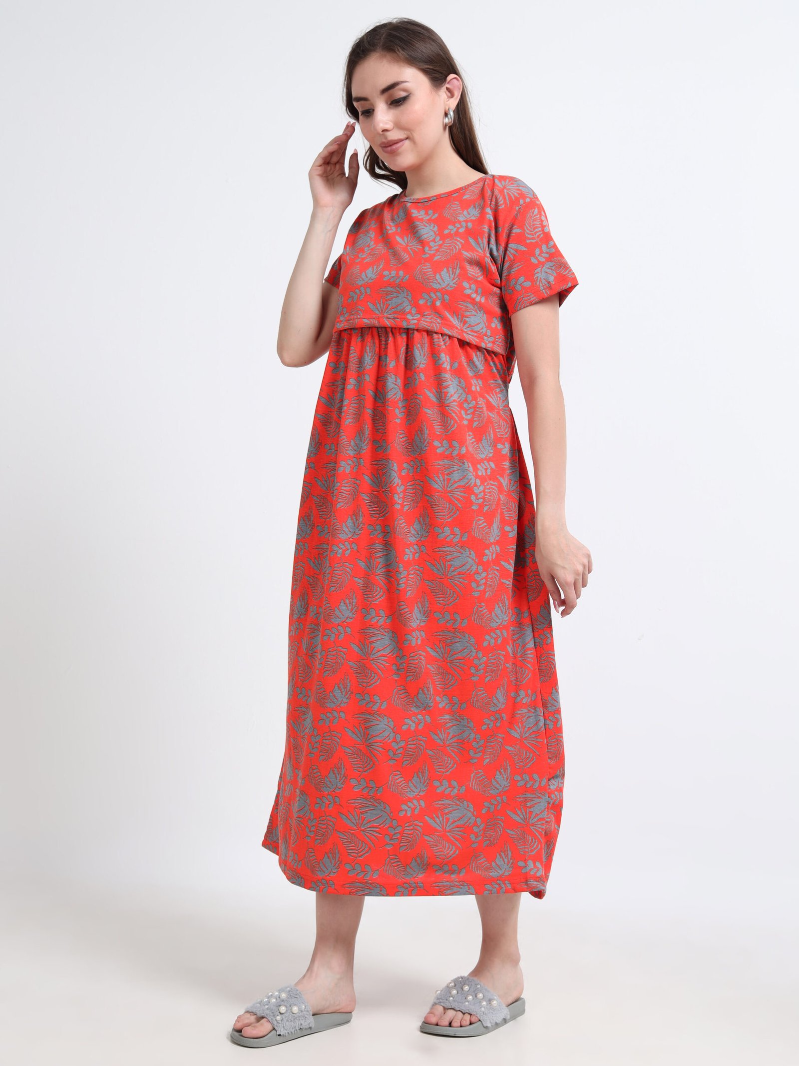 The rich red base with subtle leaf prints adds a modern, elegant touch—perfect for daily wear, hospital stays, casual outings, or relaxed lounging at home.